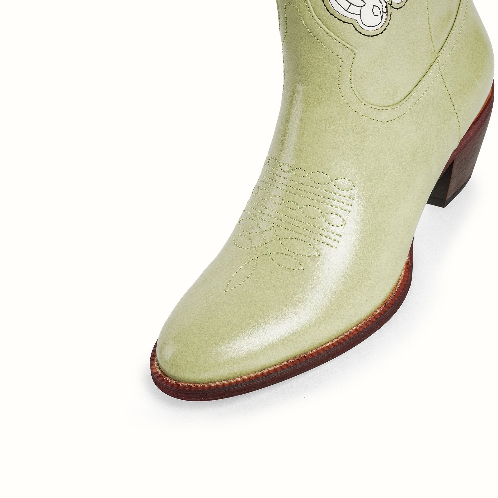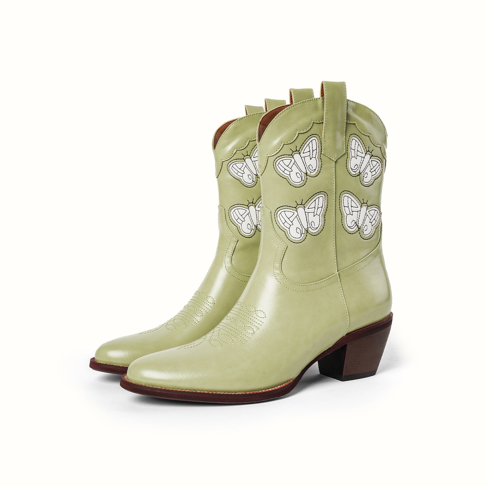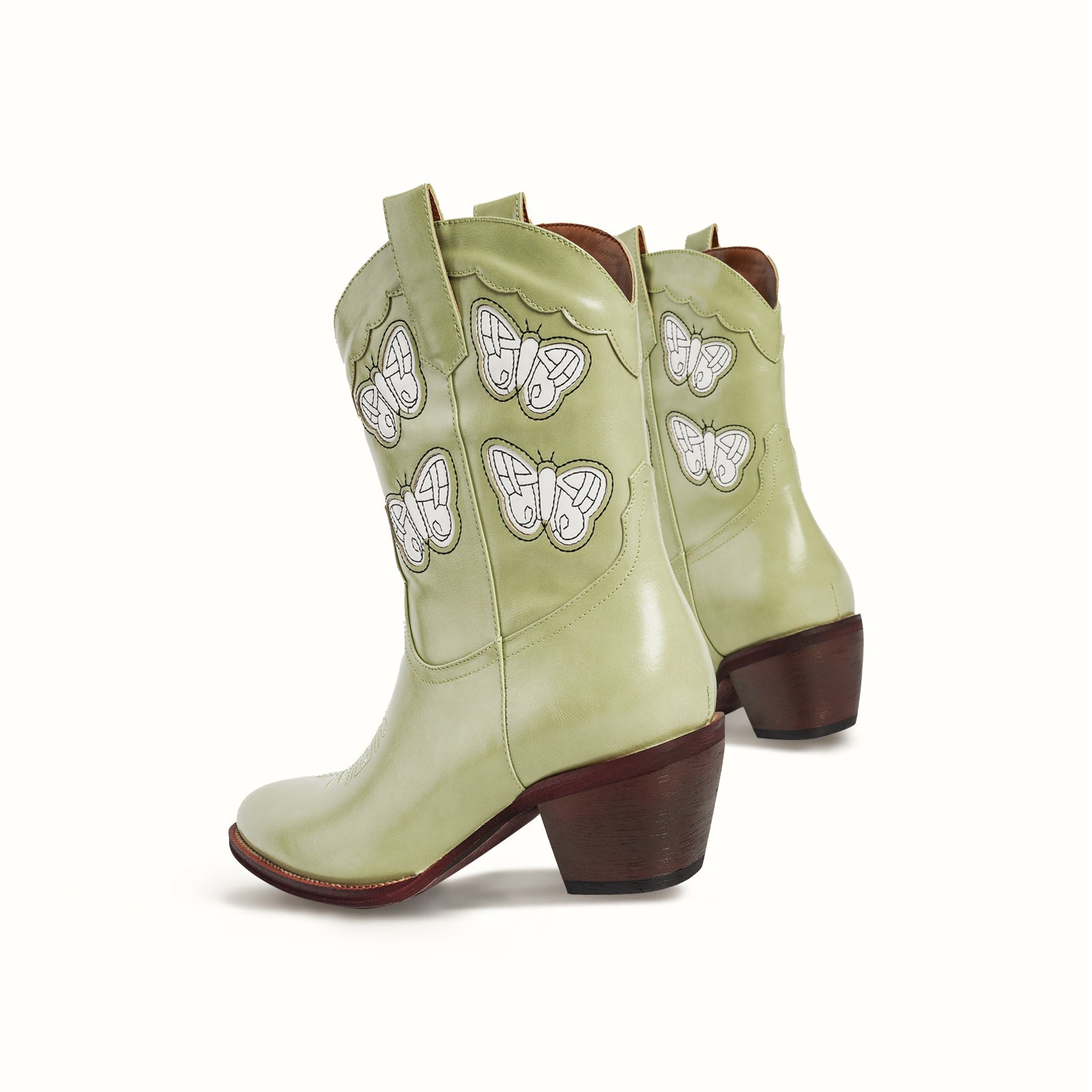 Mid-calf butterfly inlay smooth vegan leather Western boots in light green.