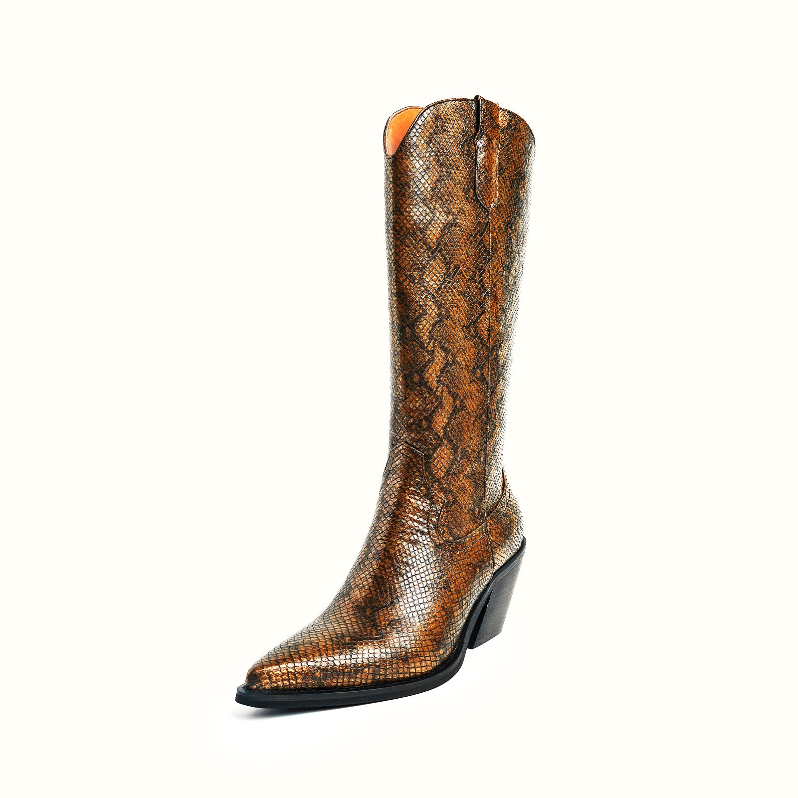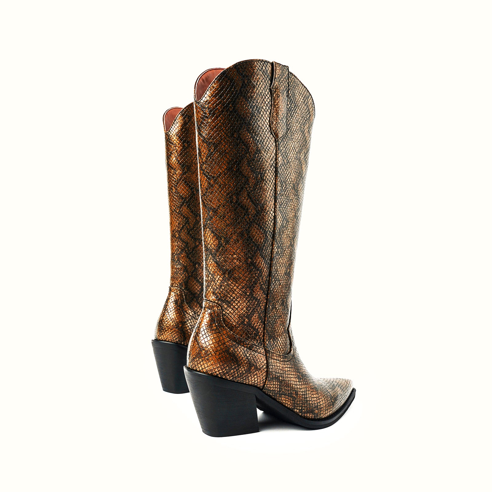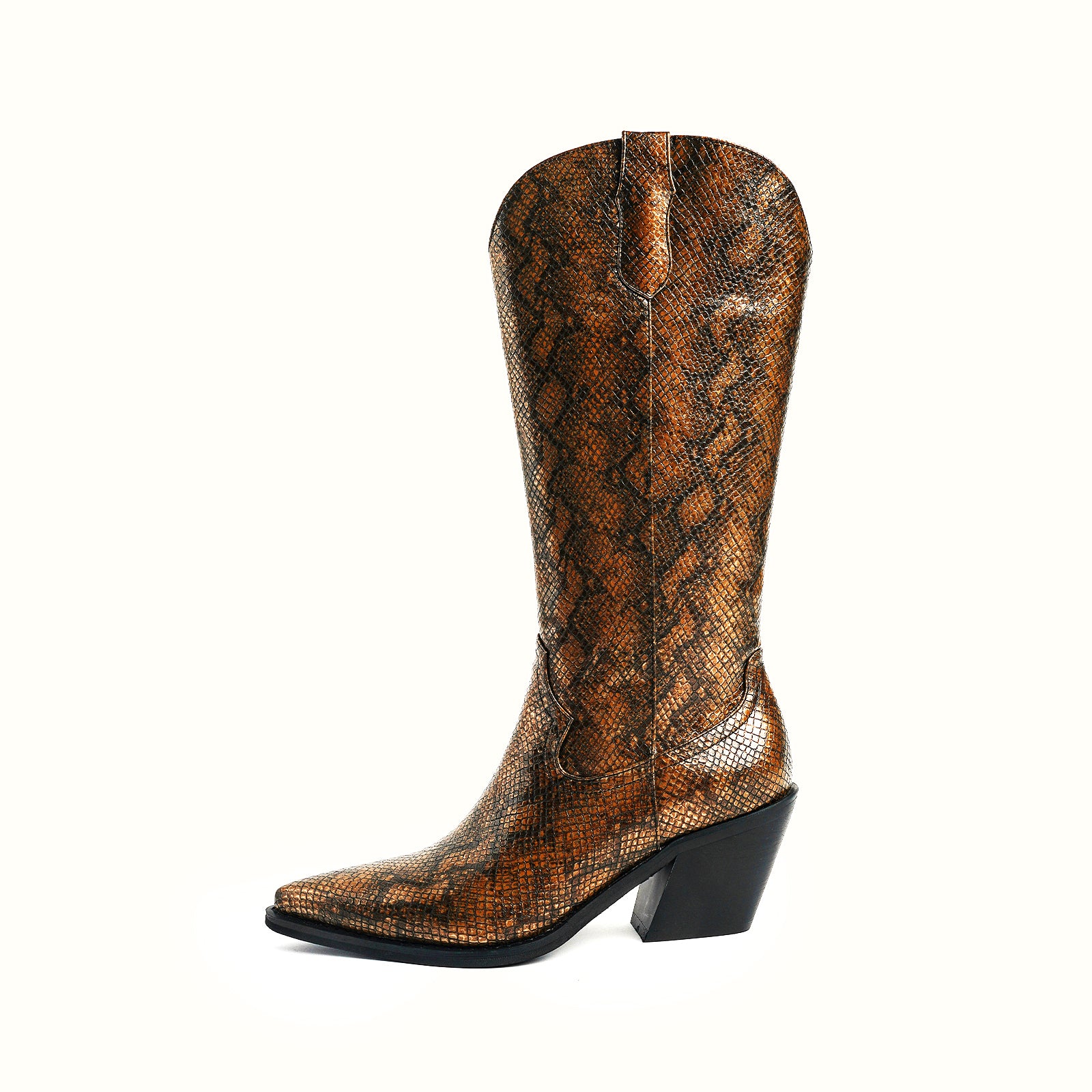 Mid-calf python-effect vegan leather WESTERN boots in bronze.