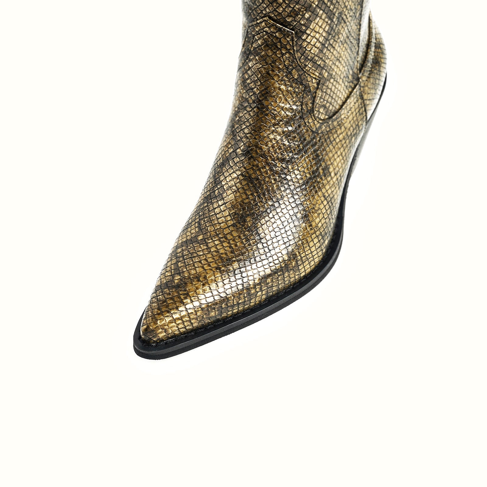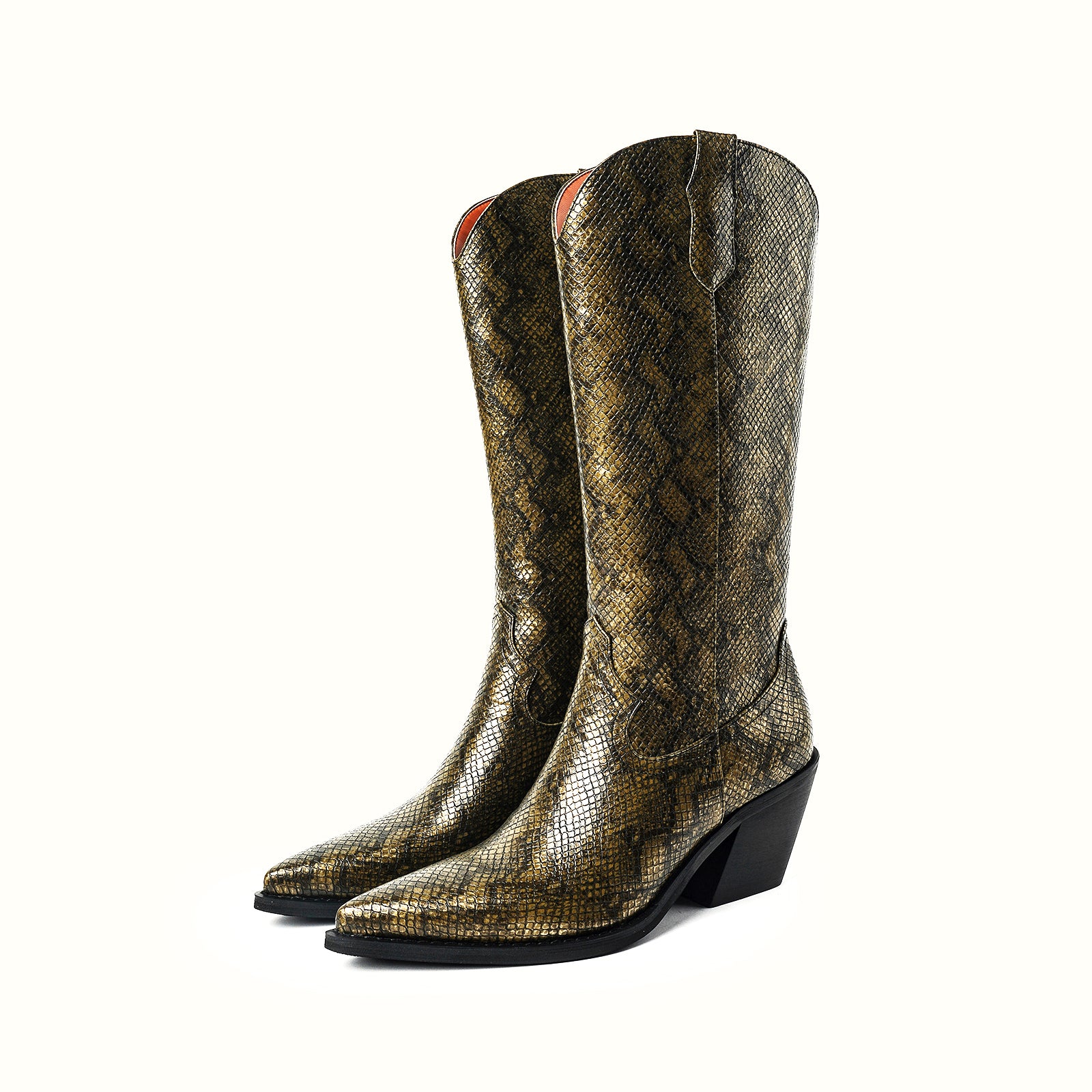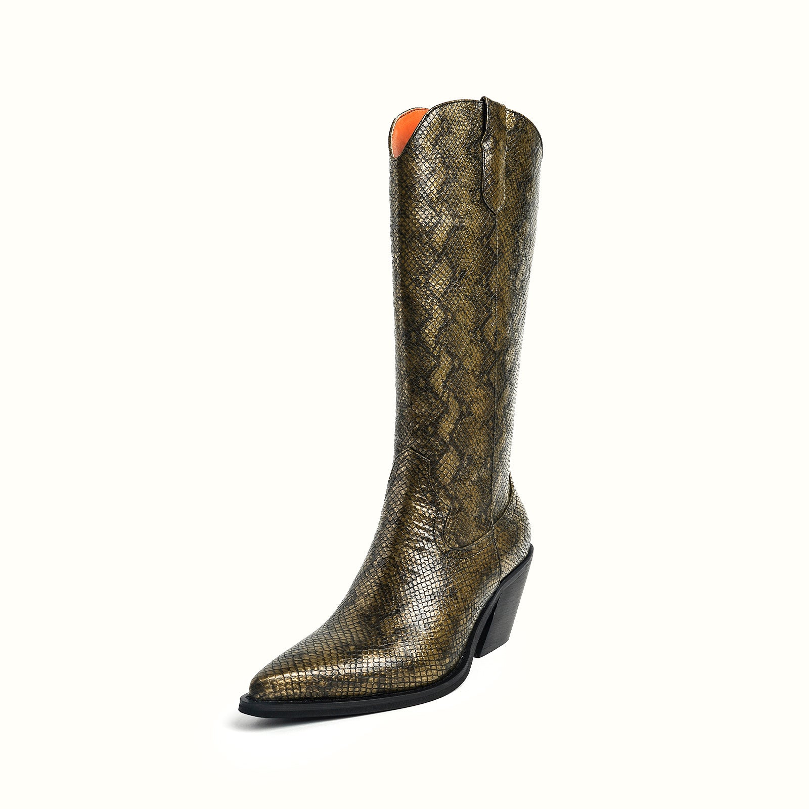 Mid-calf python-effect vegan leather WESTERN boots in green.