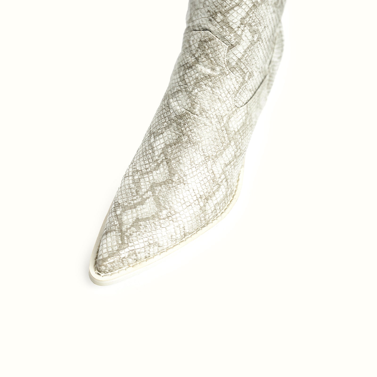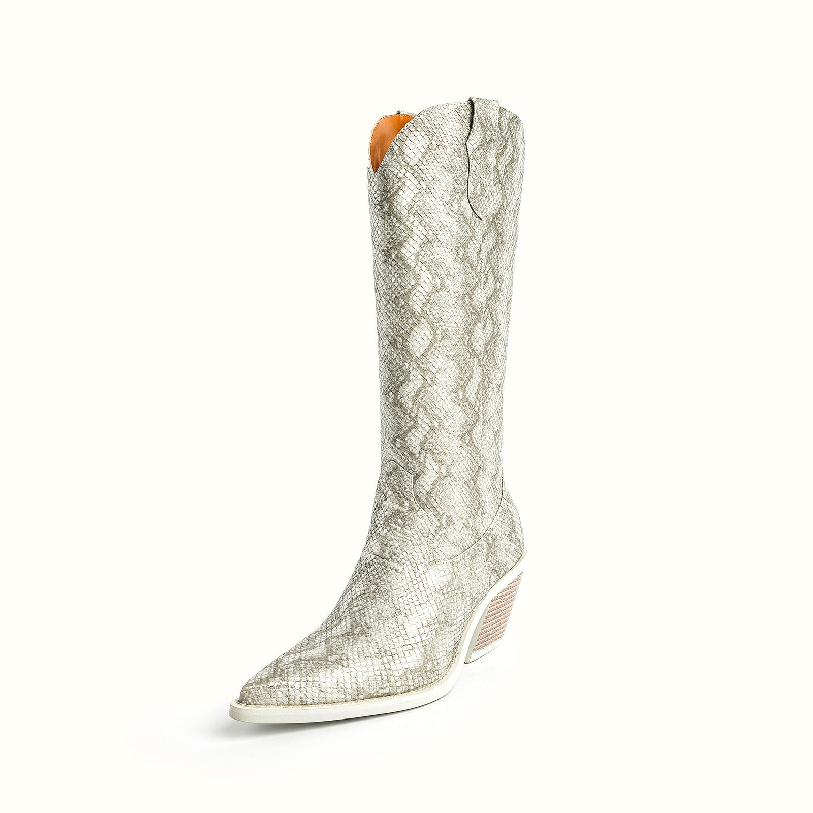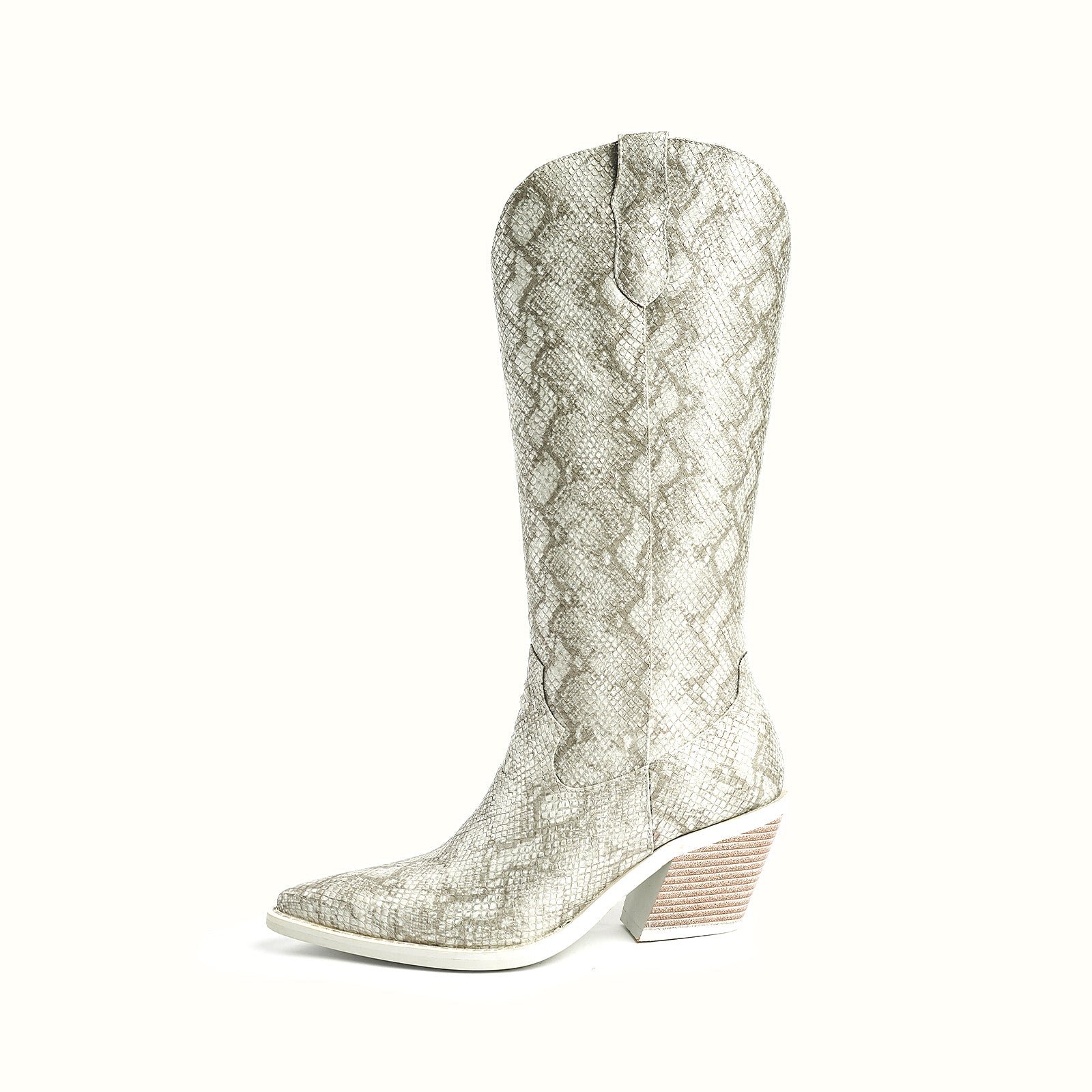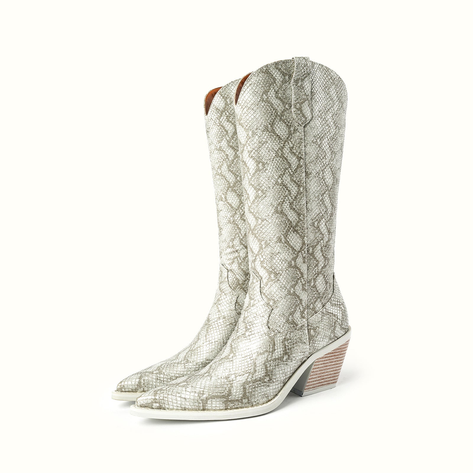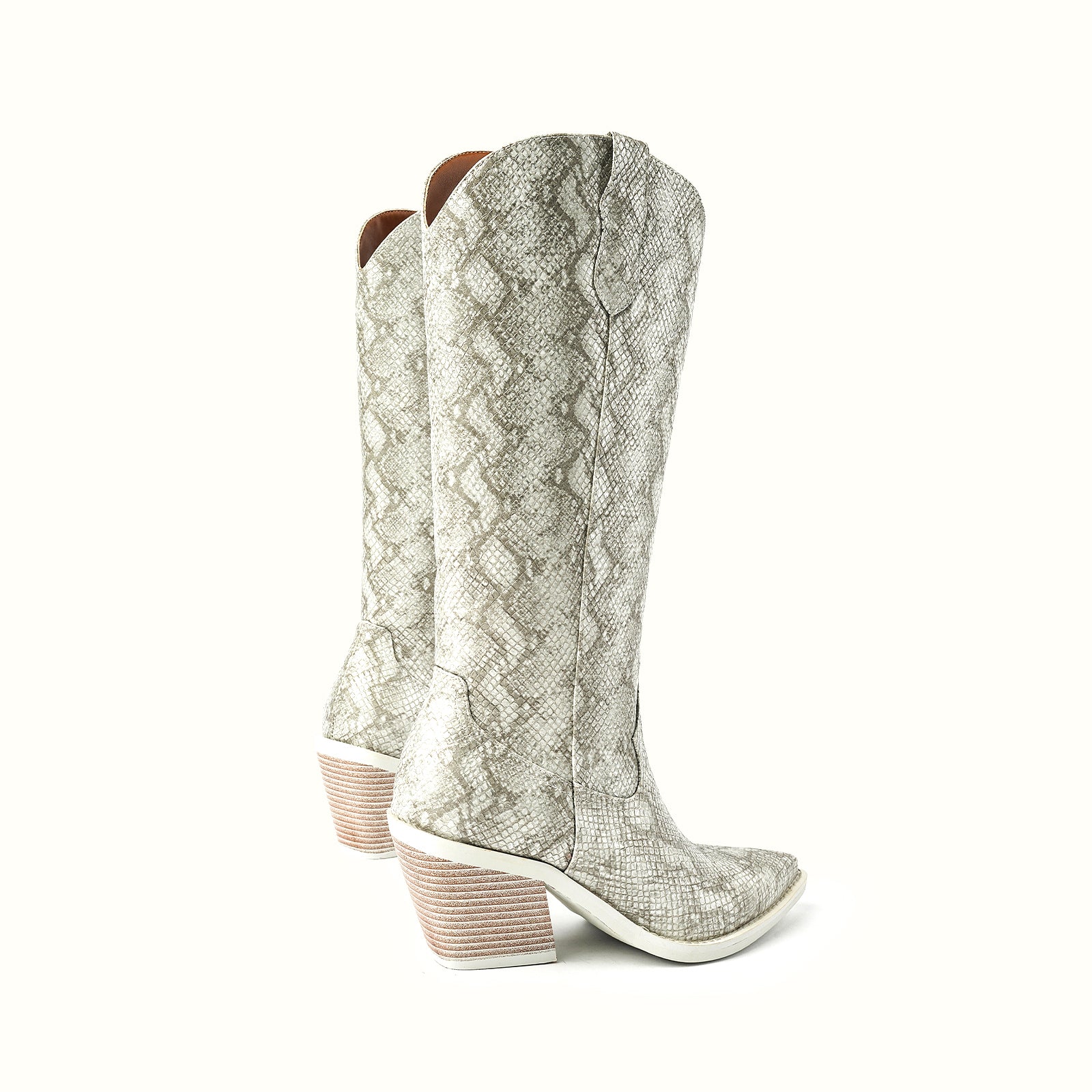 Mid-calf python-effect vegan leather WESTERN boots in silver ash.