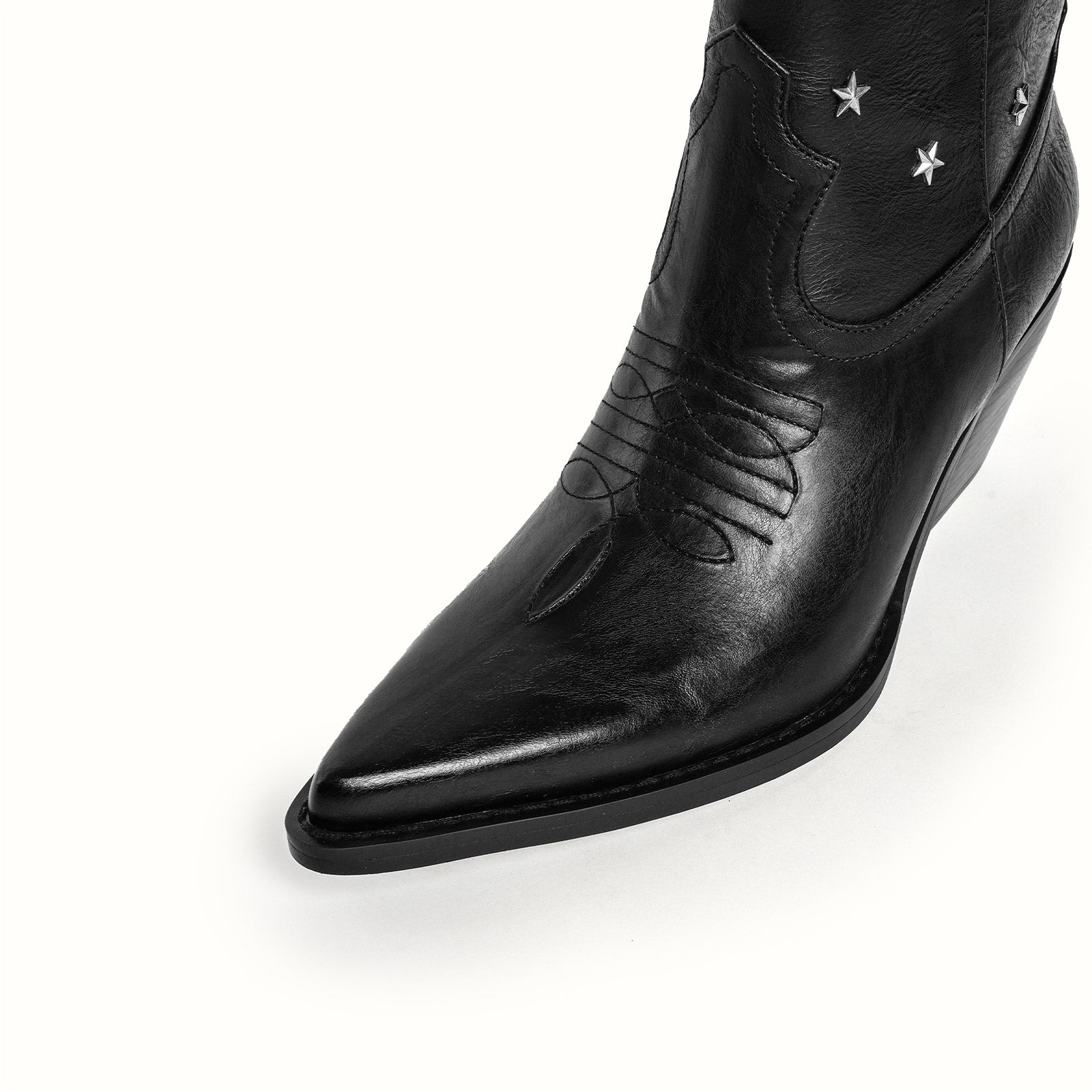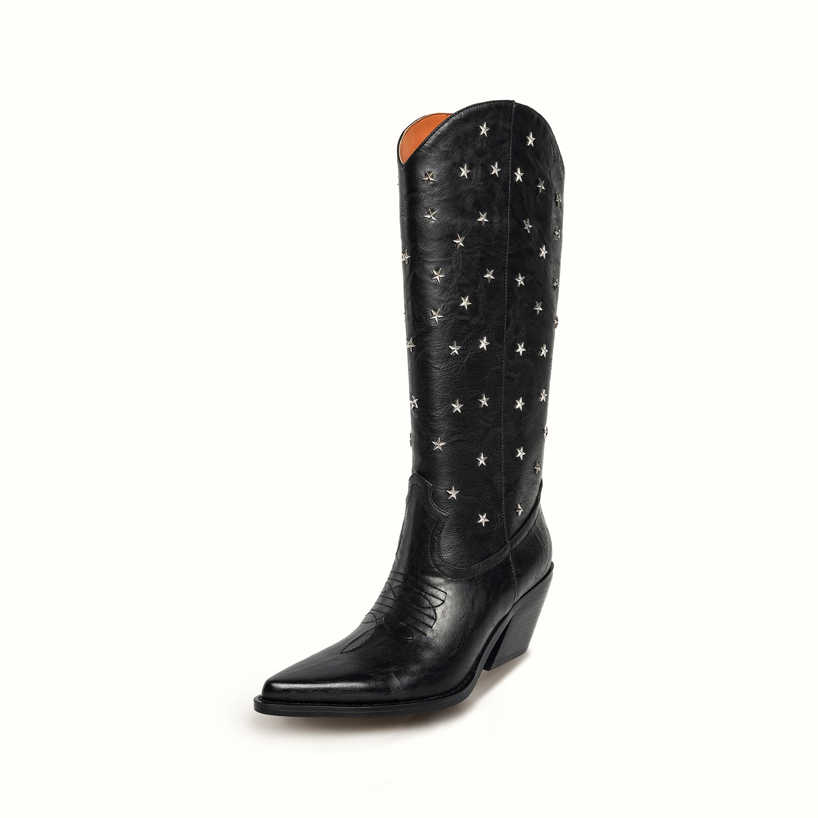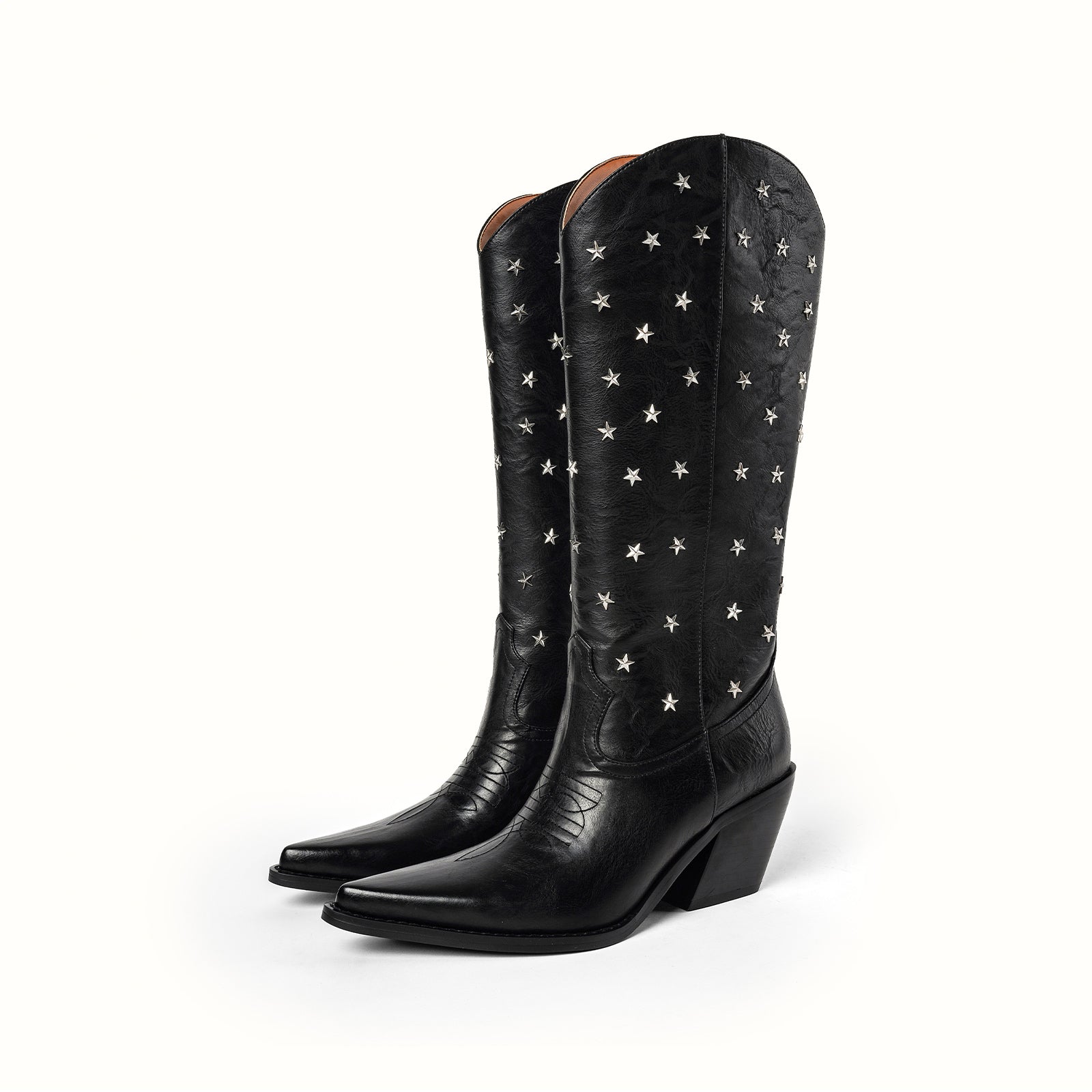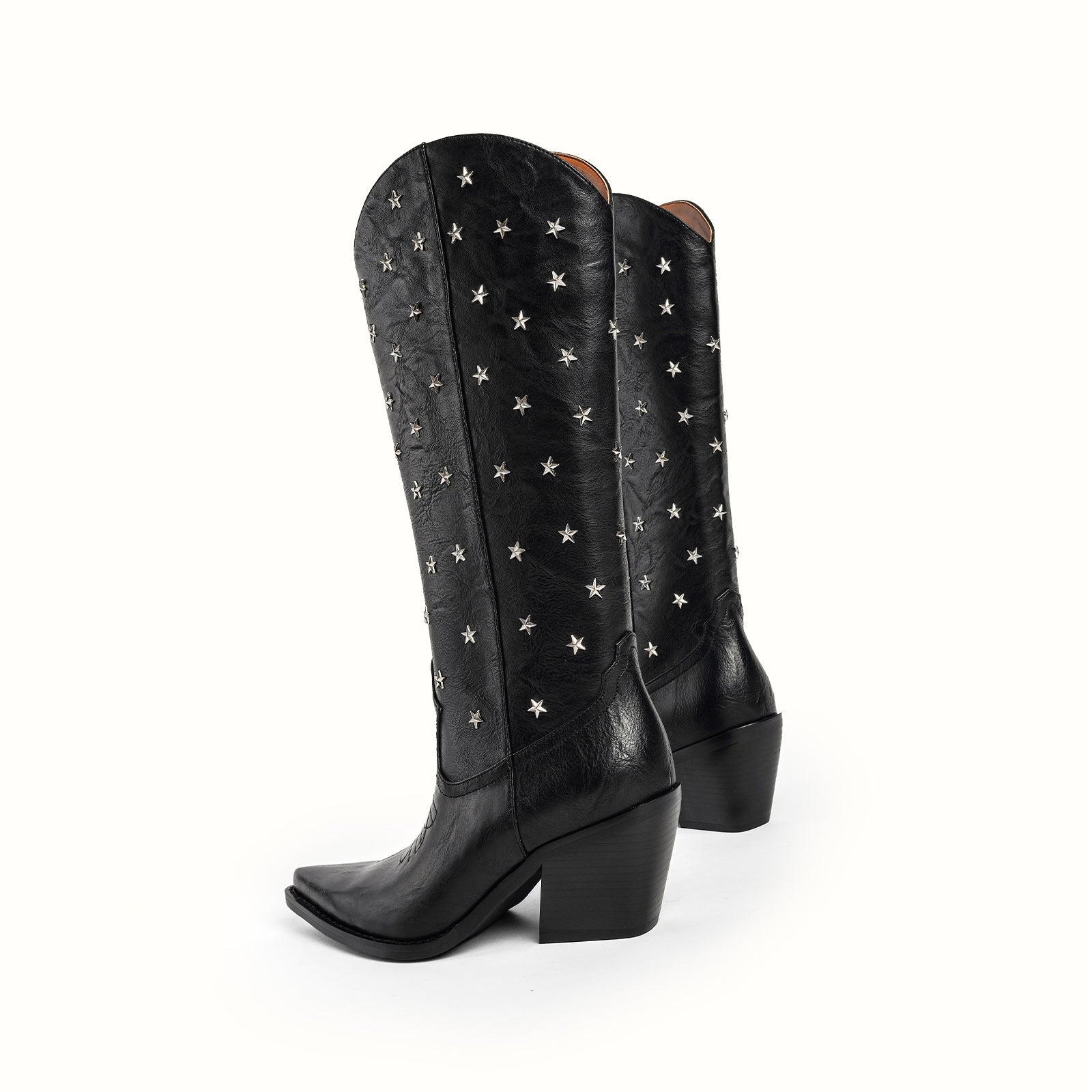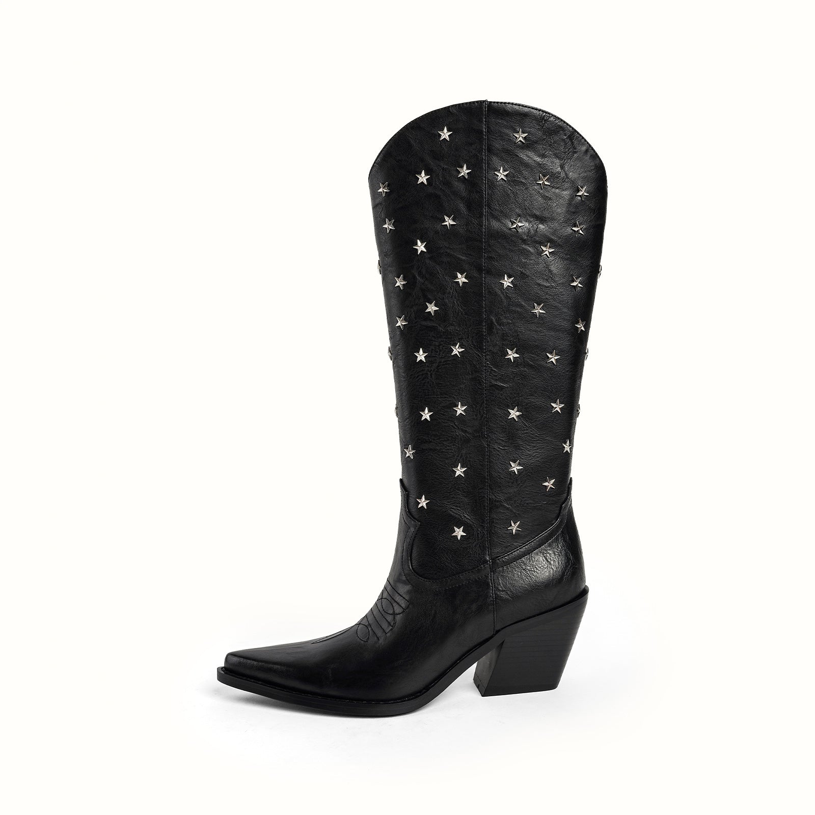 Mid-calf vegan leather WESTERN boots with metallic star applique in black.