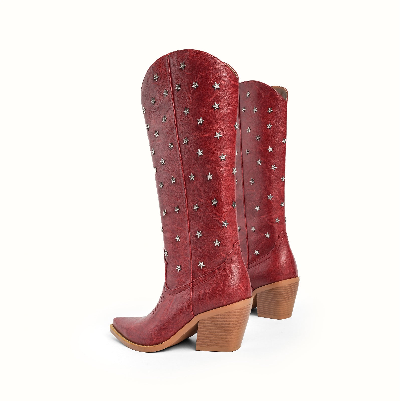 Mid-calf vegan leather WESTERN boots with metallic star applique in red.