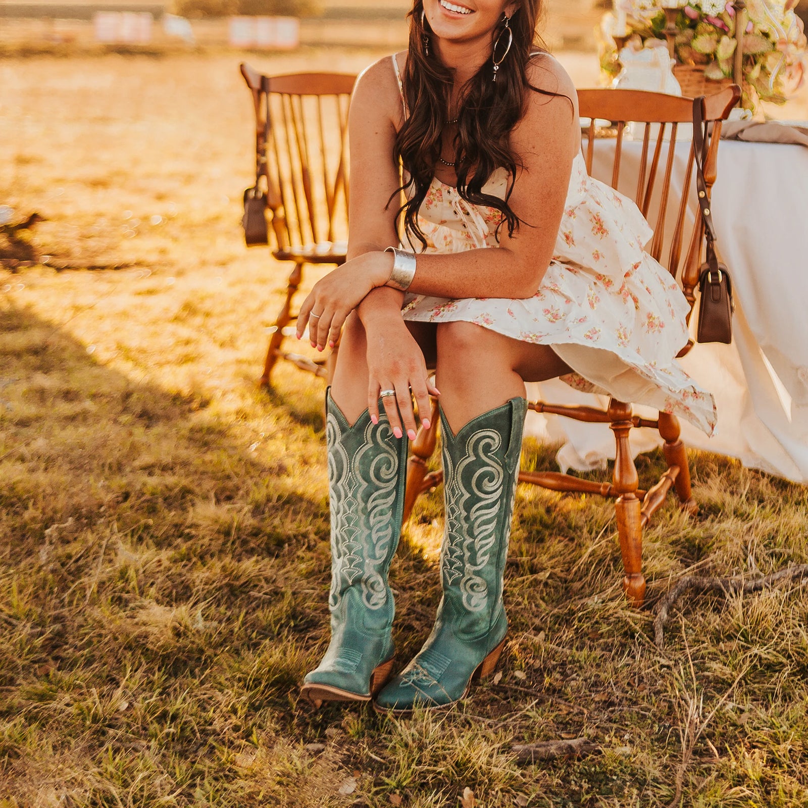 Turquoise Almond-Toe Curled Embroidery Full-Zip Knee High Cowgirl Boots.