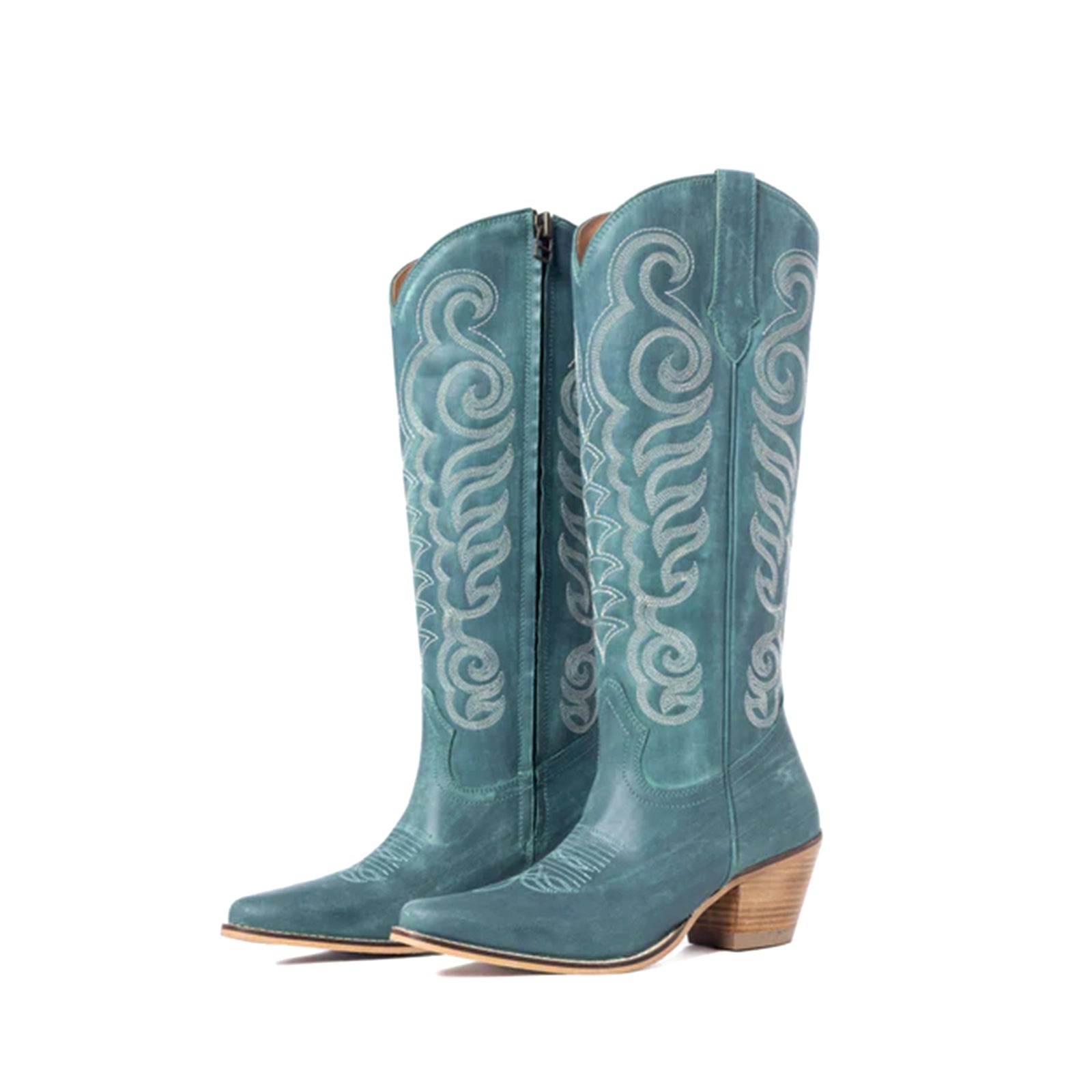Turquoise Almond-Toe Curled Embroidery Full-Zip Knee High Cowgirl Boots