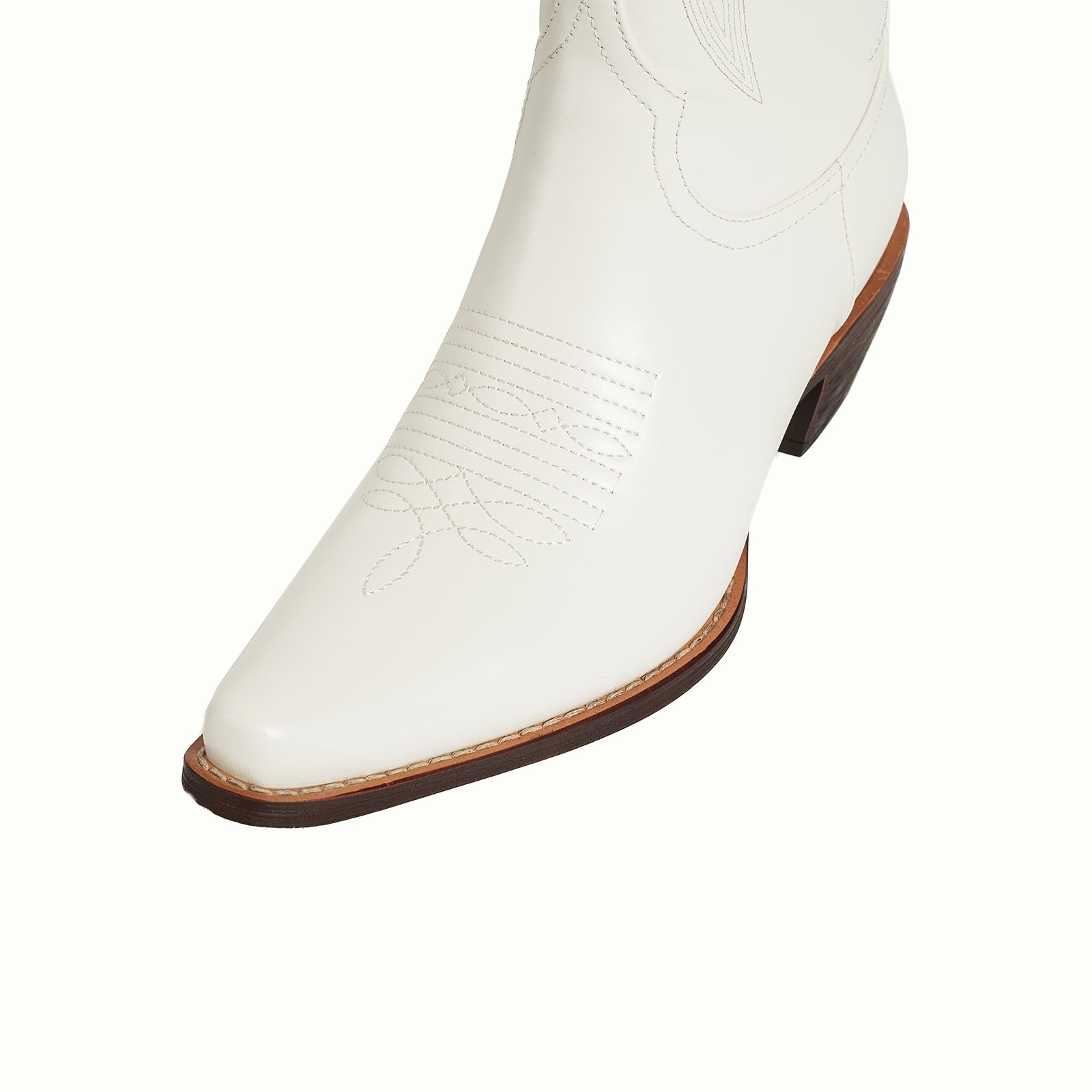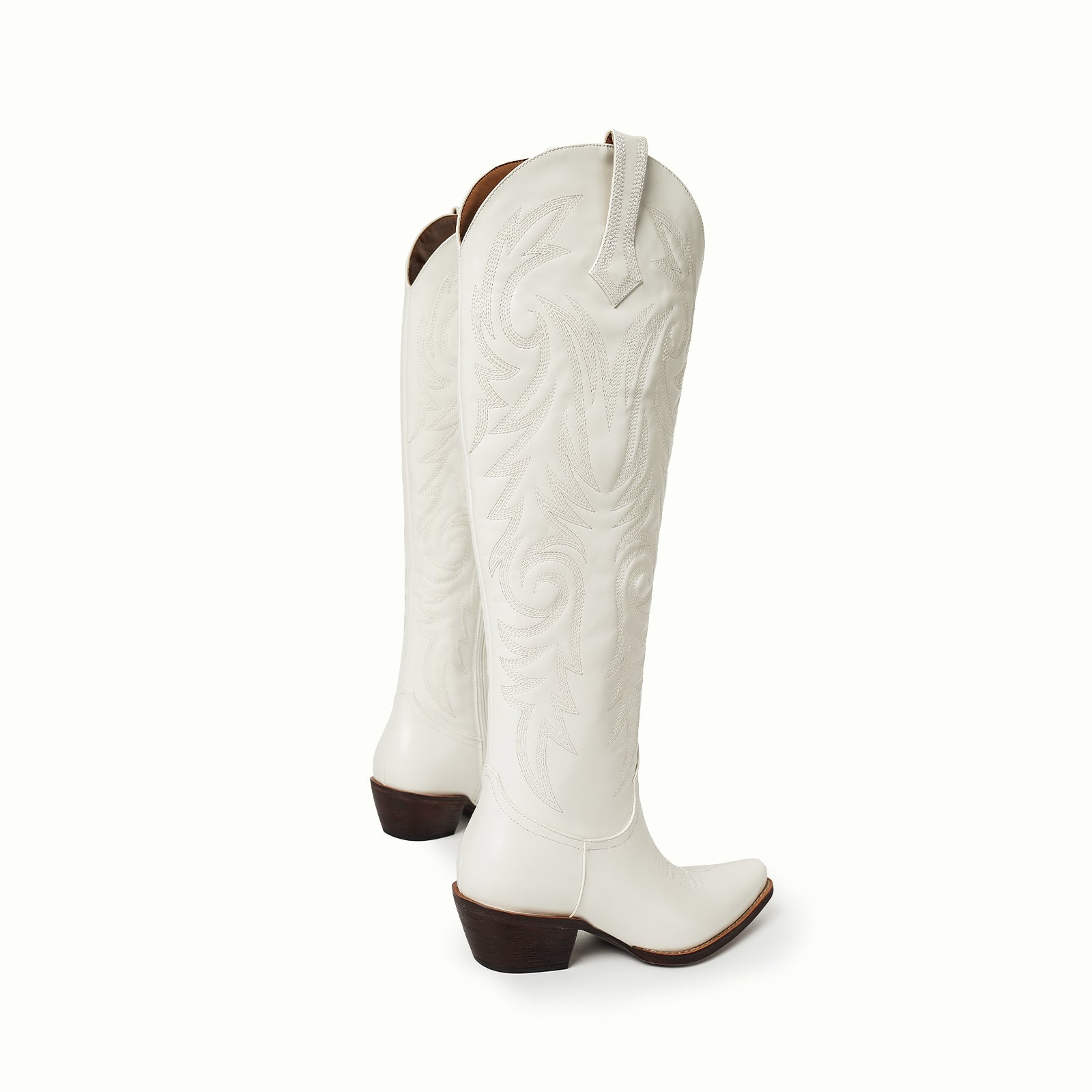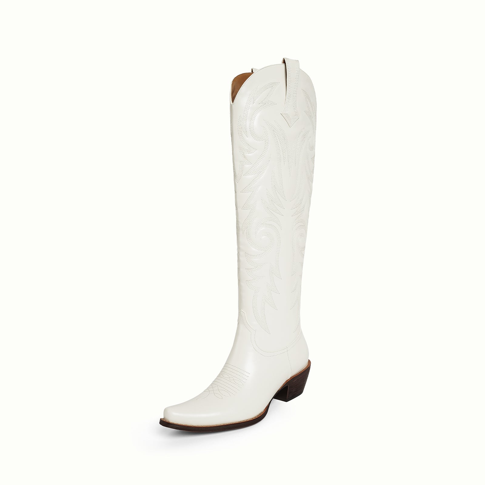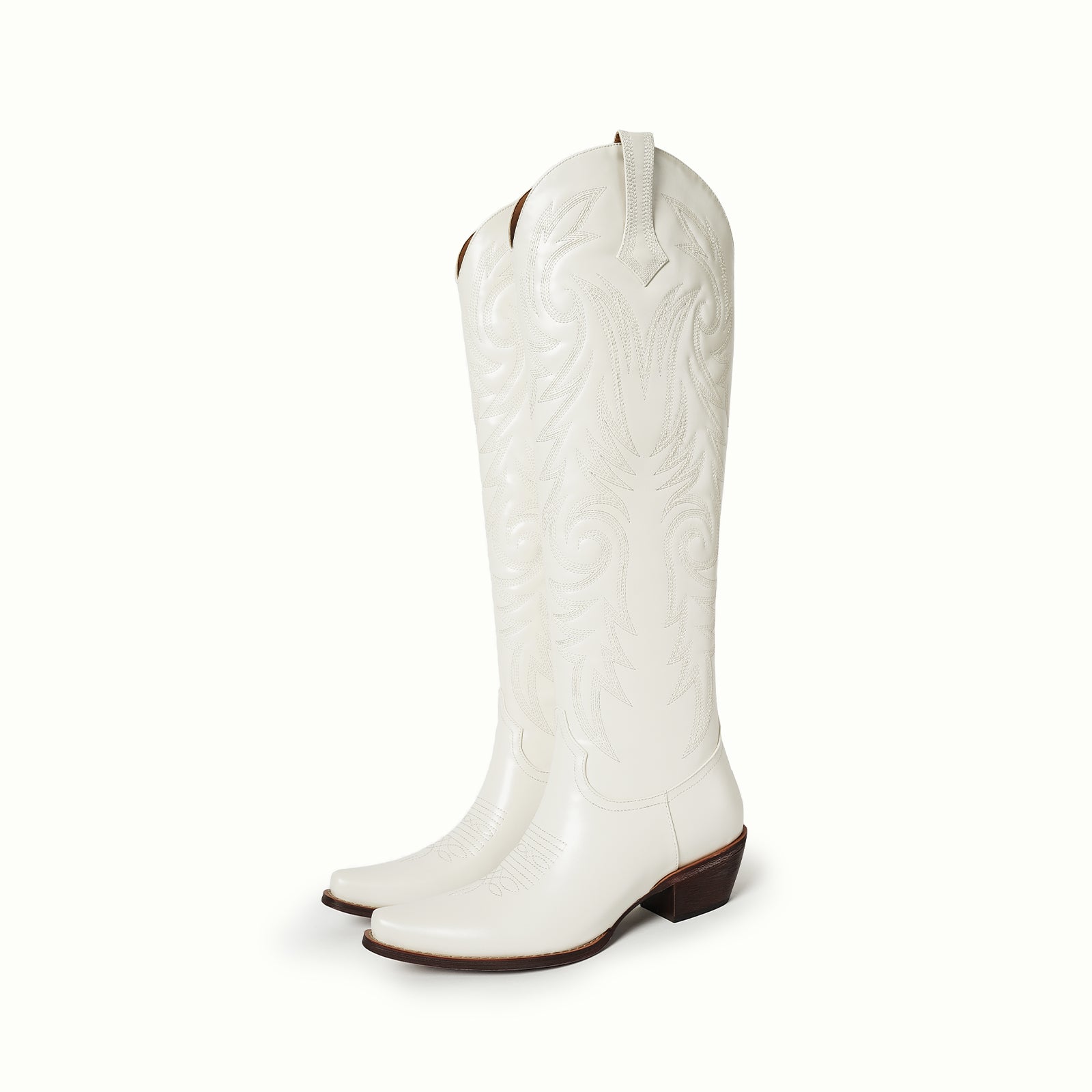 Knee high classic embroidery vegan leather half-zip Western tall boots in white.