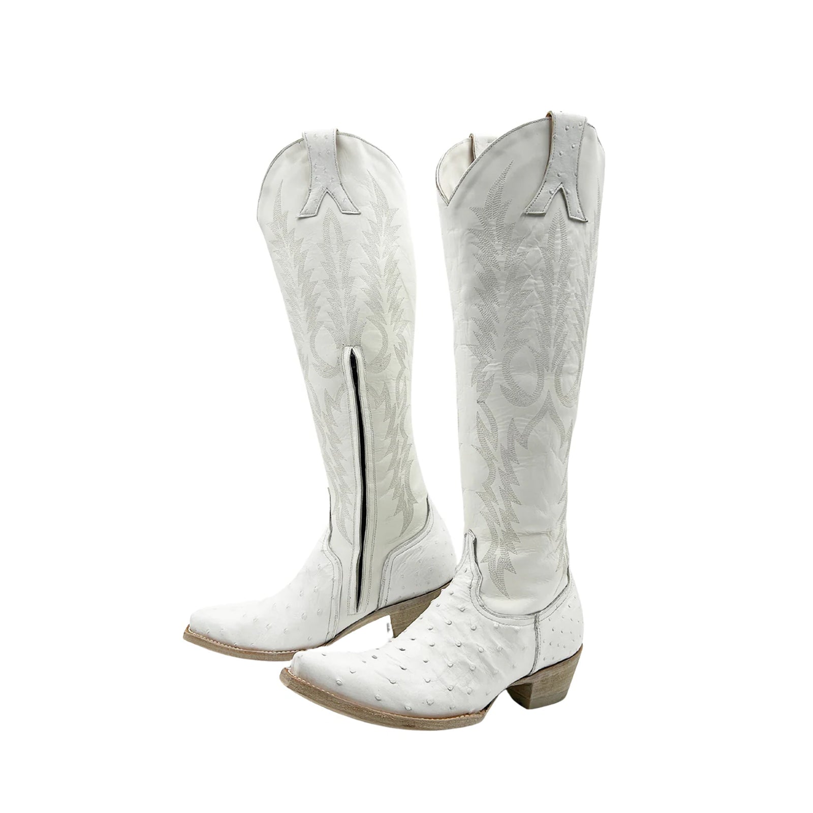 White Ostrich-Patterned Snip-Toe Embroidery Half-Zip Knee High Cowgirl Boots