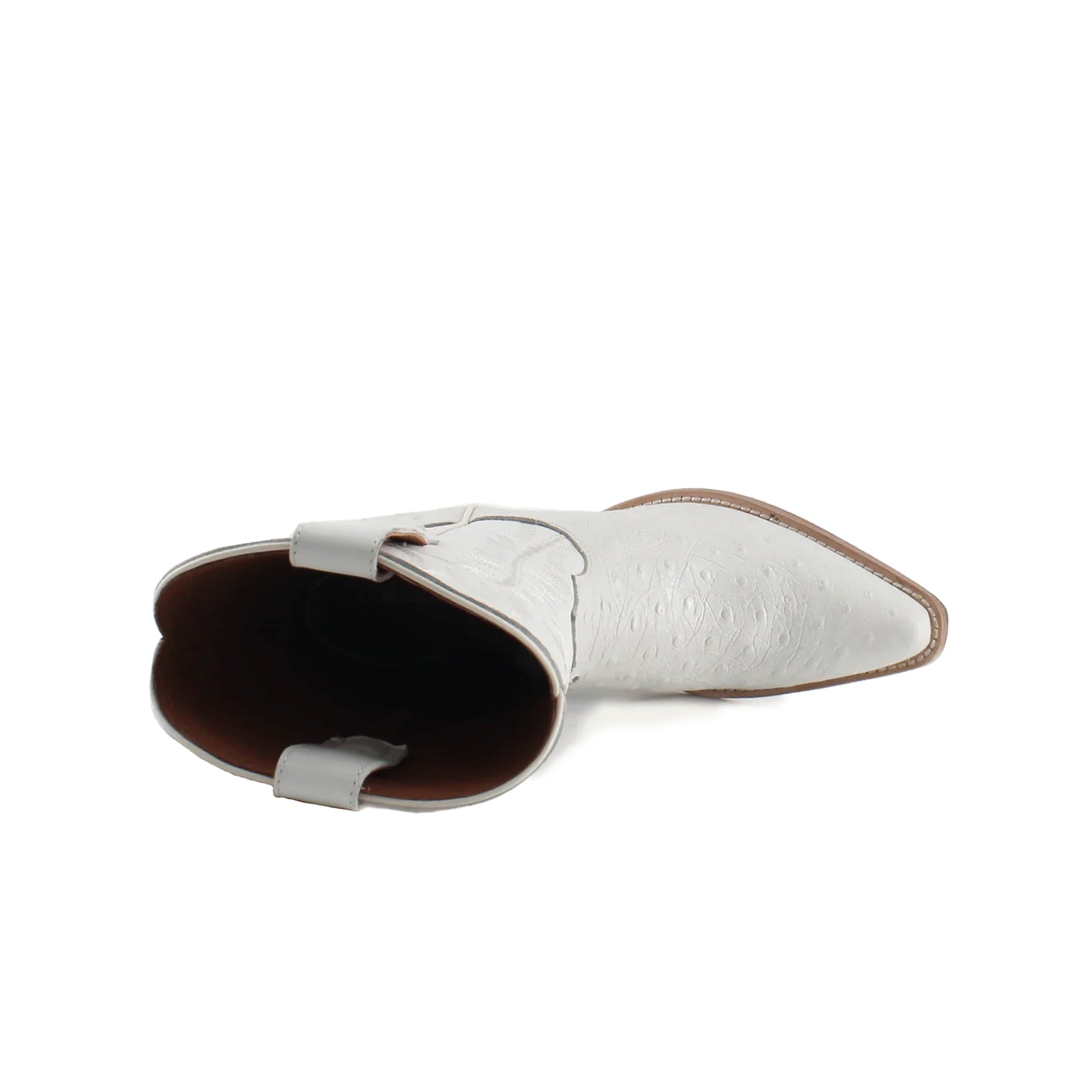Blending texture and tone, these boots fuse white vegan leather with white ostrich patterning, creating a striking Western look with refined edge.