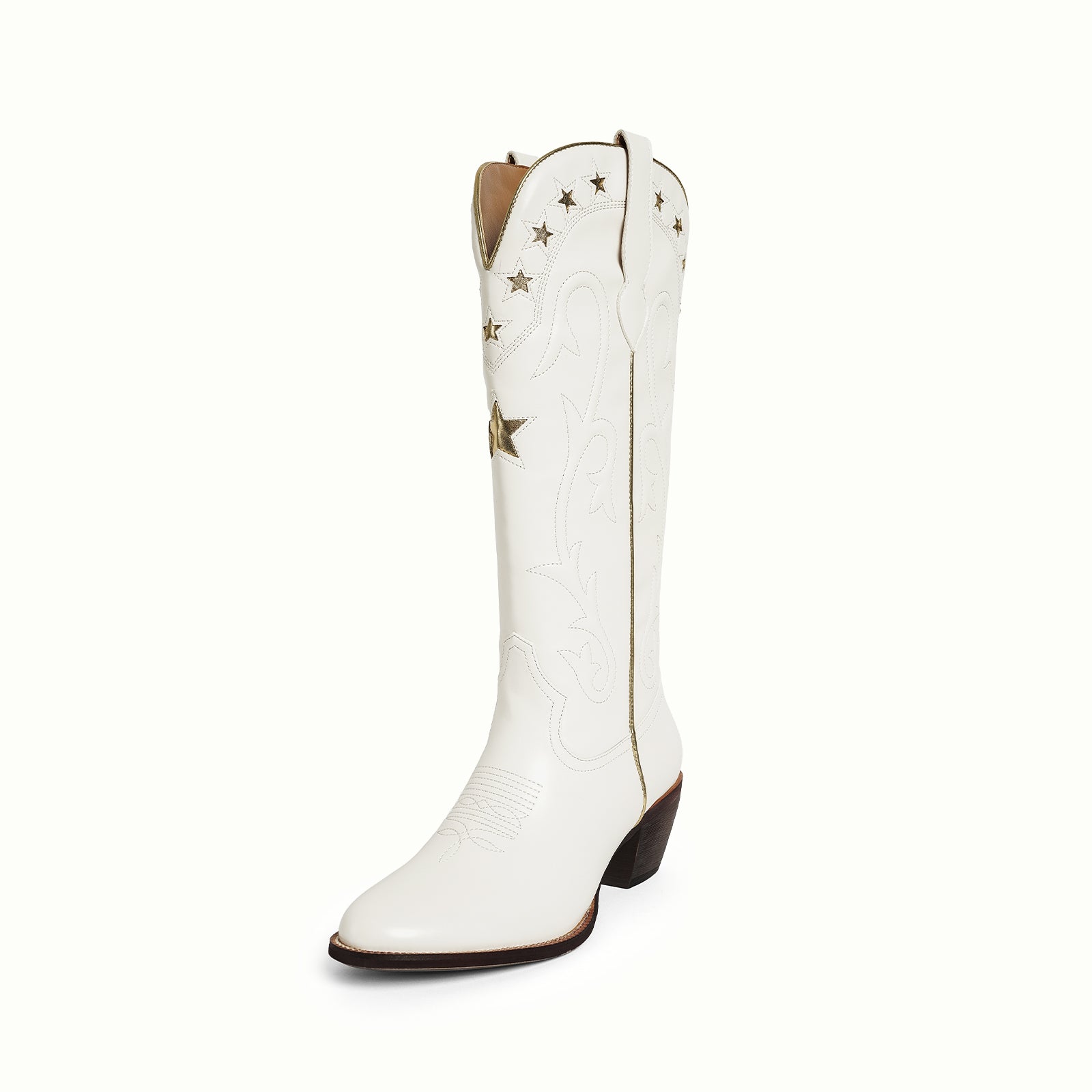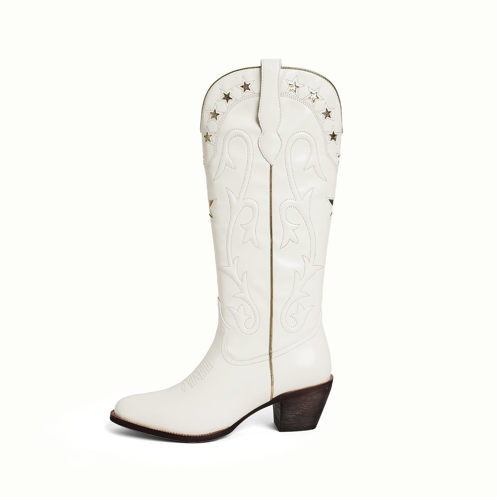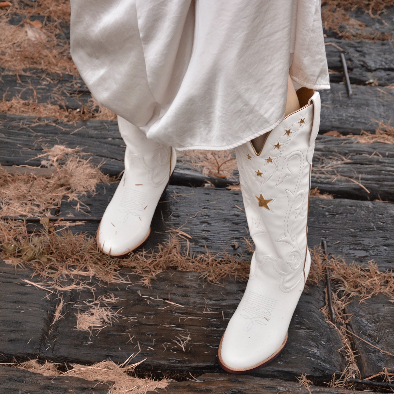 Mid-calf vegan leather WESTERN boots with metallic star inlay and padded detail in white.