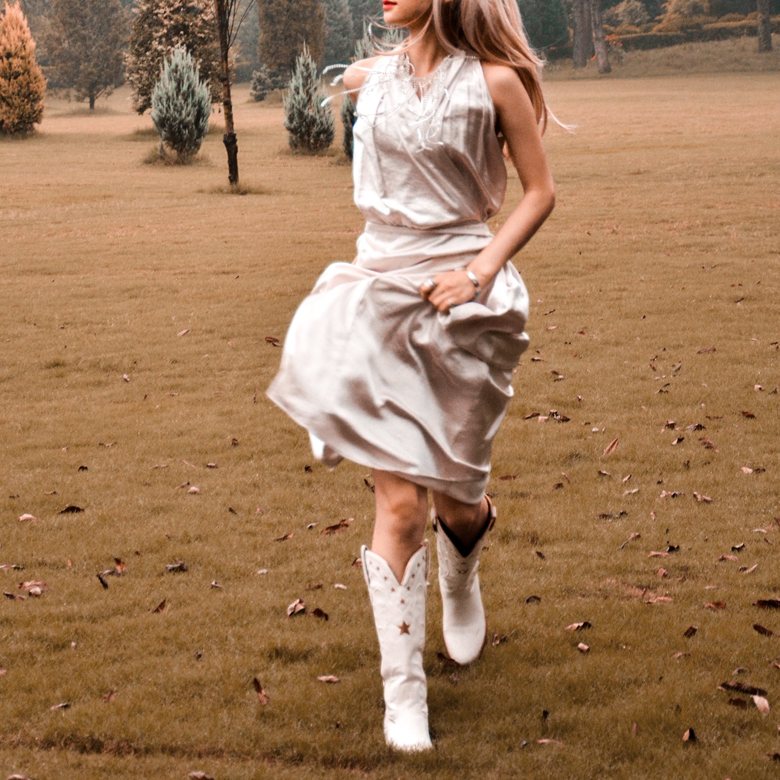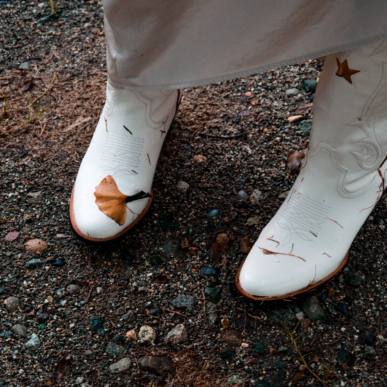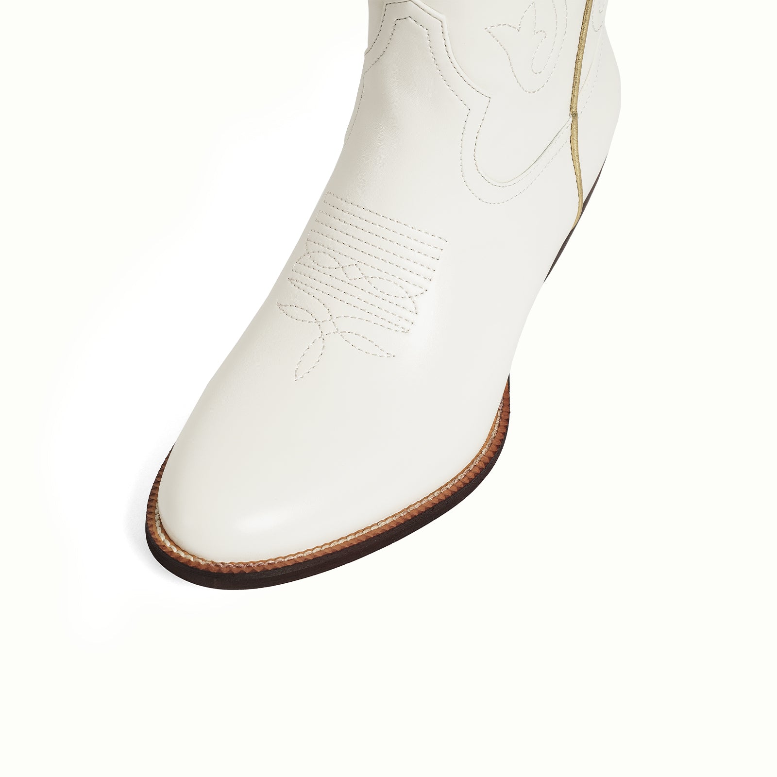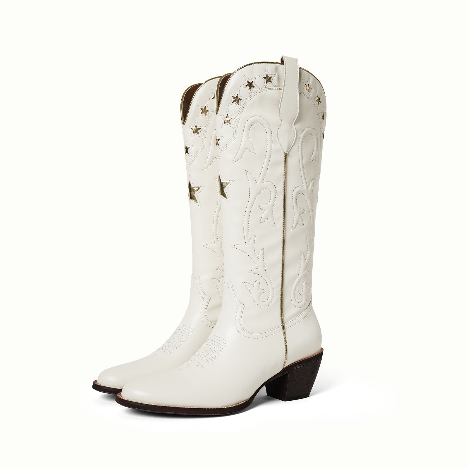 Mid-calf vegan leather WESTERN boots with metallic star inlay and padded detail in white.