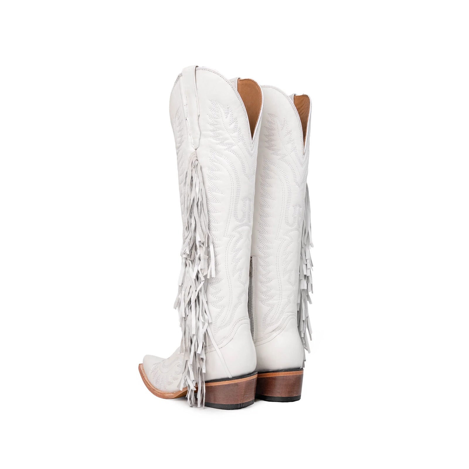 White Snip-Toe Western Embroidery Side Fringe Half-Zip Knee High Cowgirl Boots.