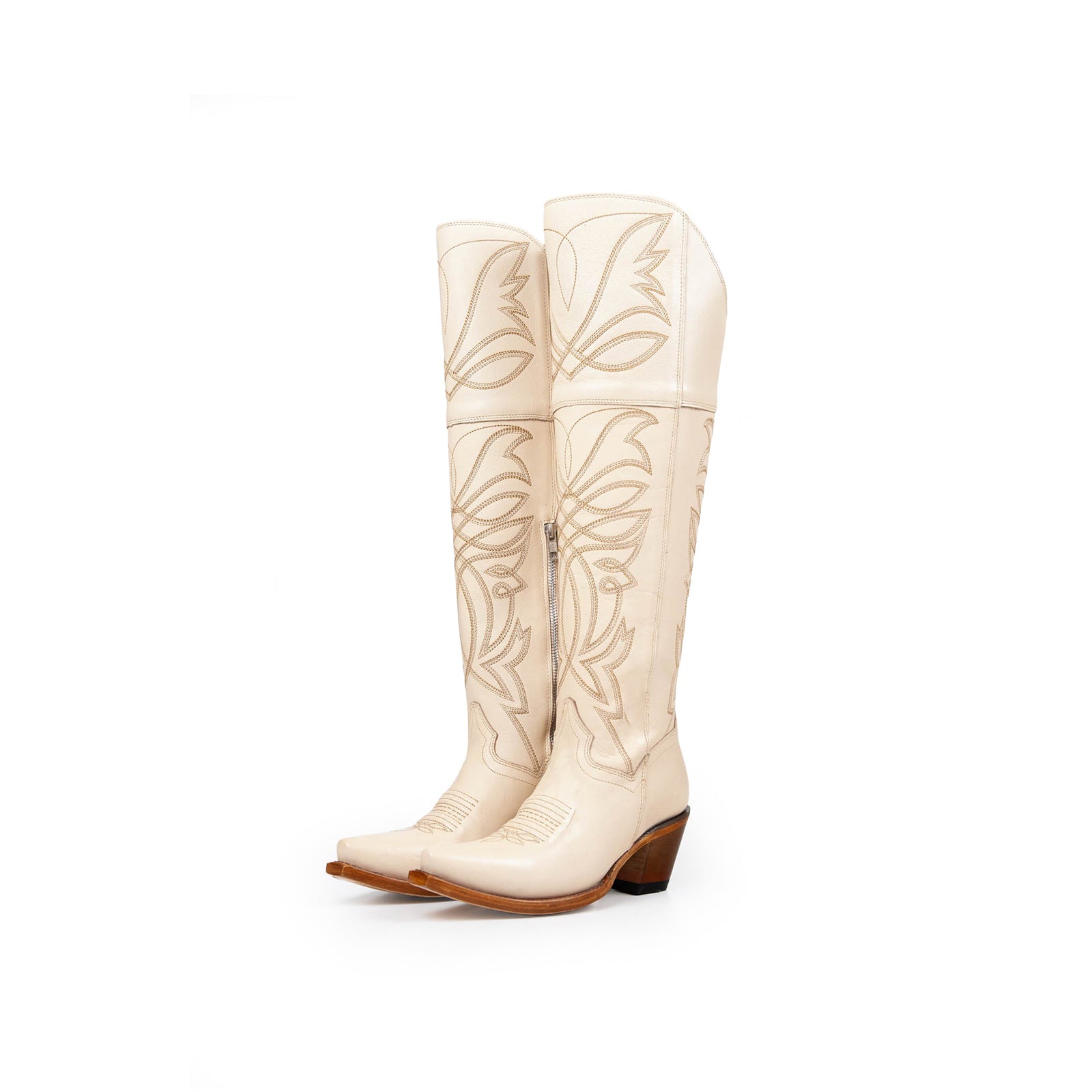 White Snip-Toe Half-Zip Western Embroidery Knee High Cowgirl Boots.