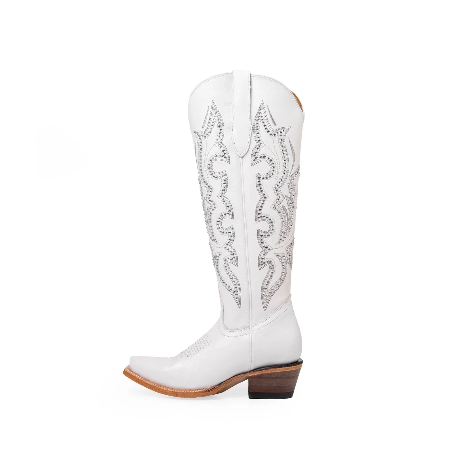 White Snip-Toe Rhinestone And Embroidery Half-Zip Knee High Cowgirl Boots.