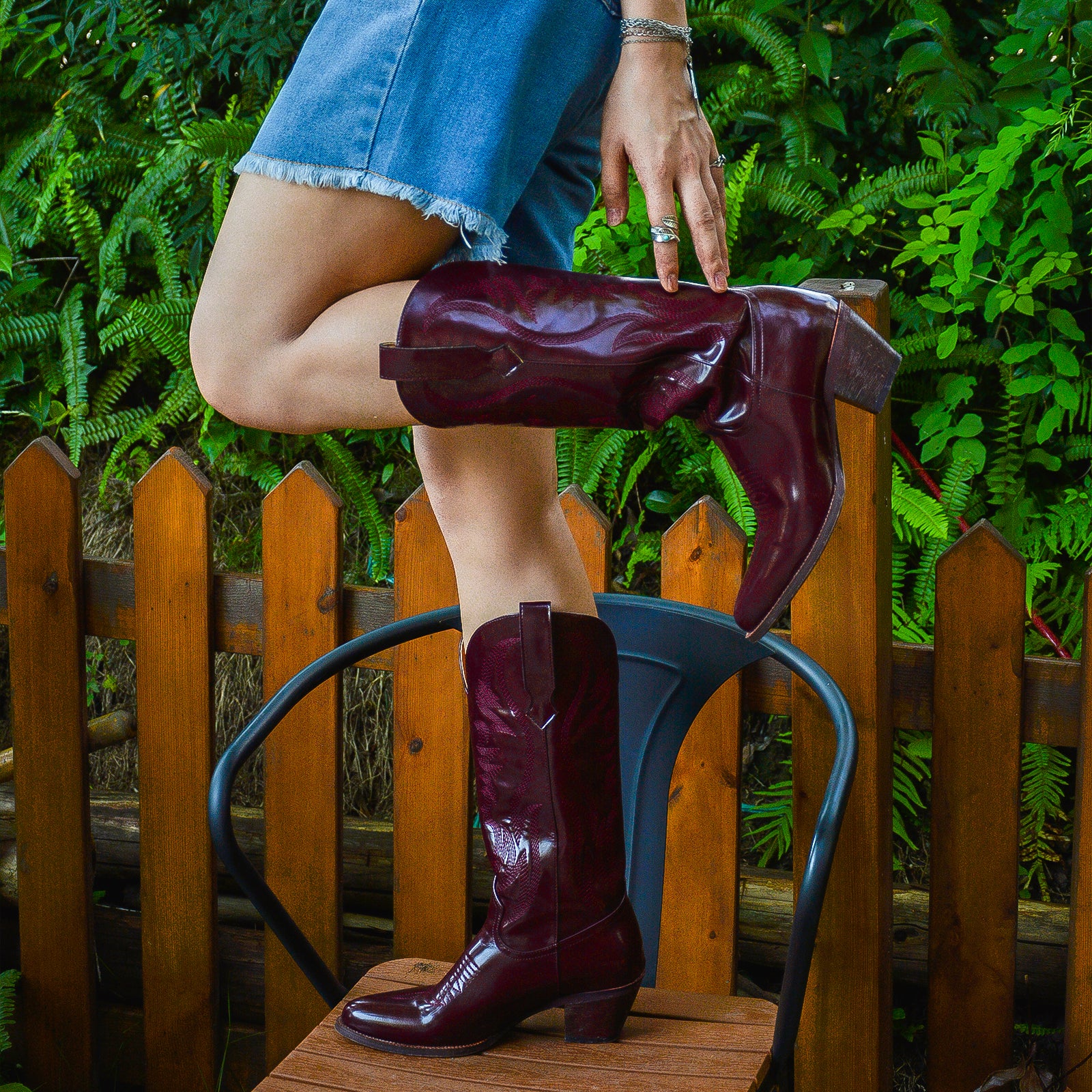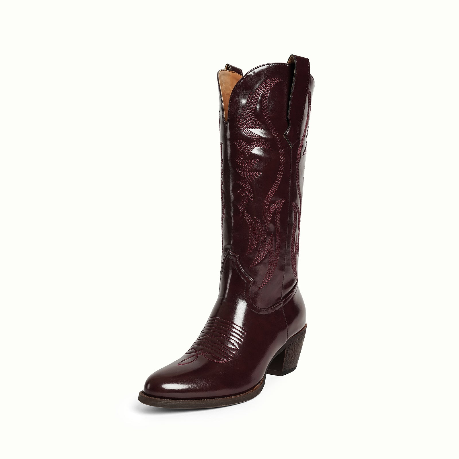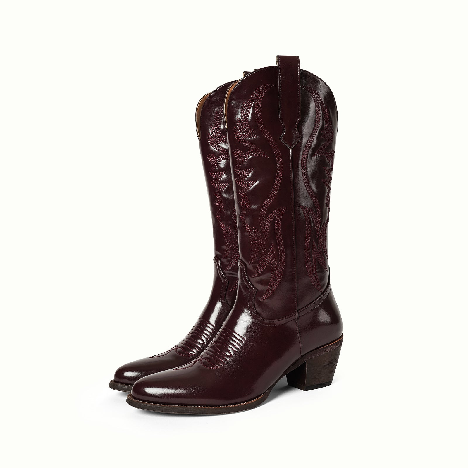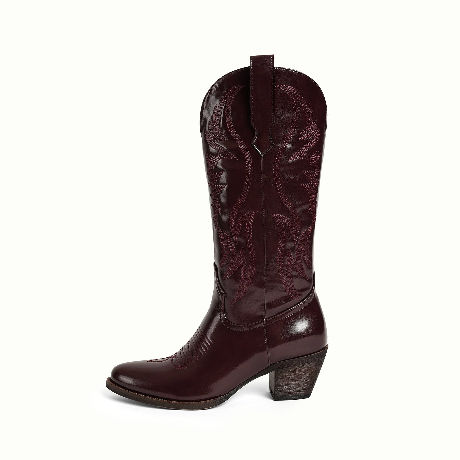 Mid-calf classic embroidery vegan leather Western boots in wine red.