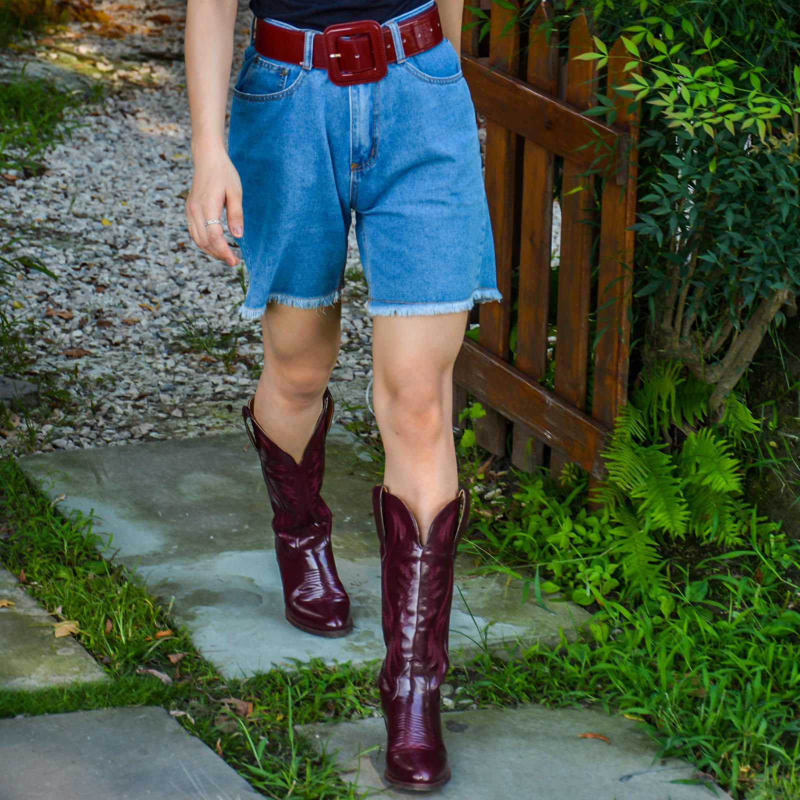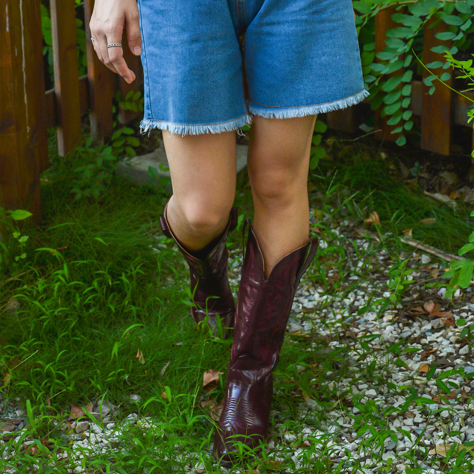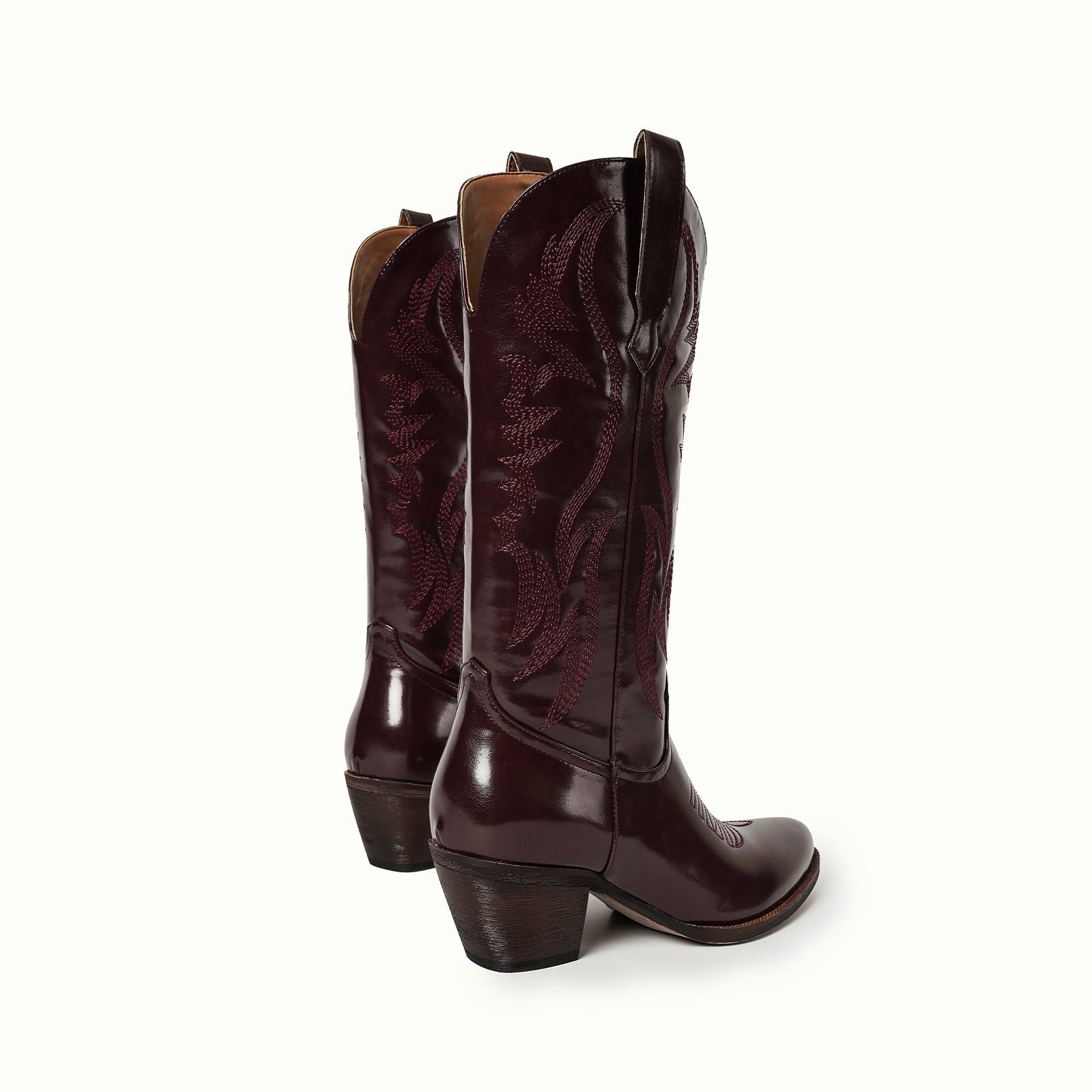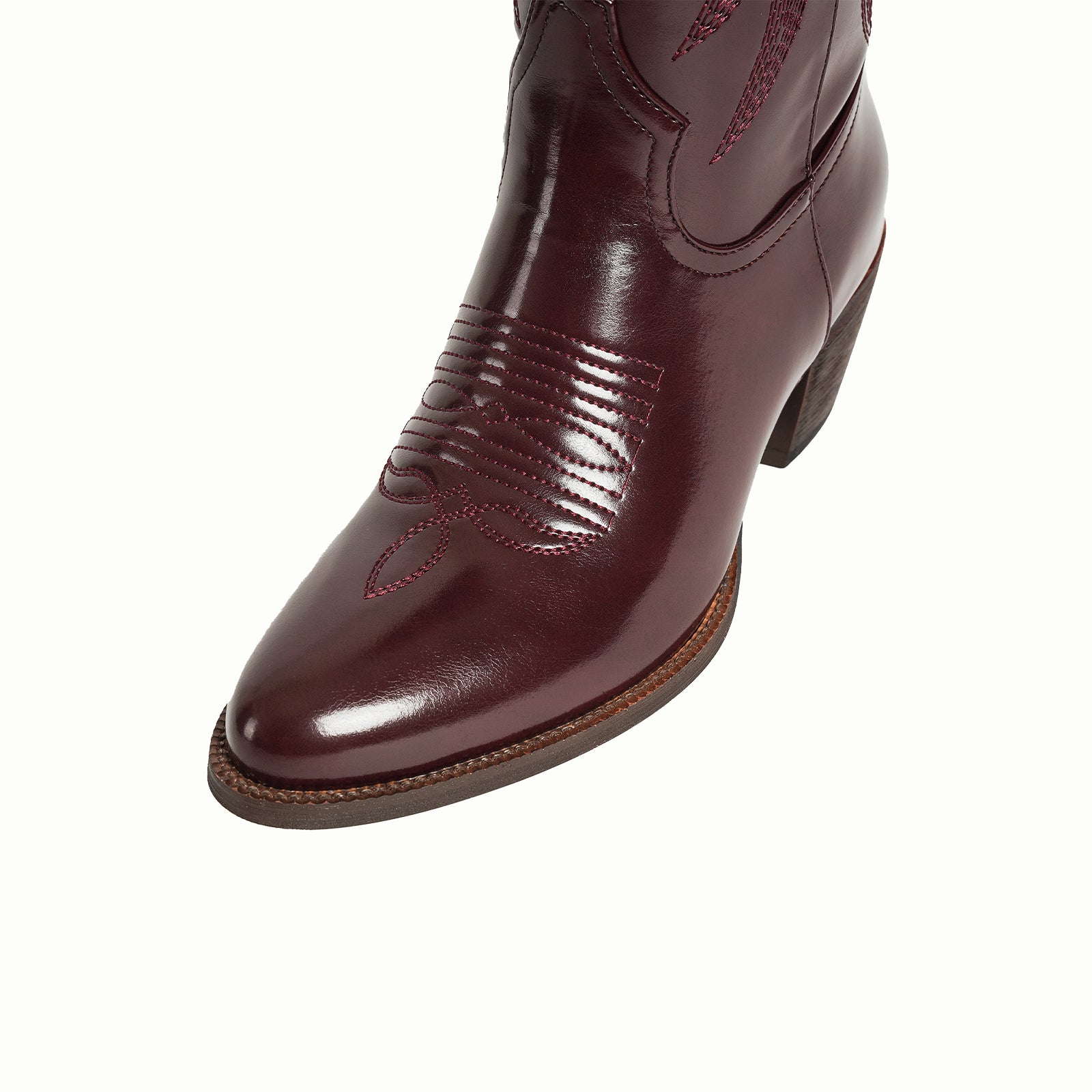 Mid-calf classic embroidery vegan leather Western boots in wine red.