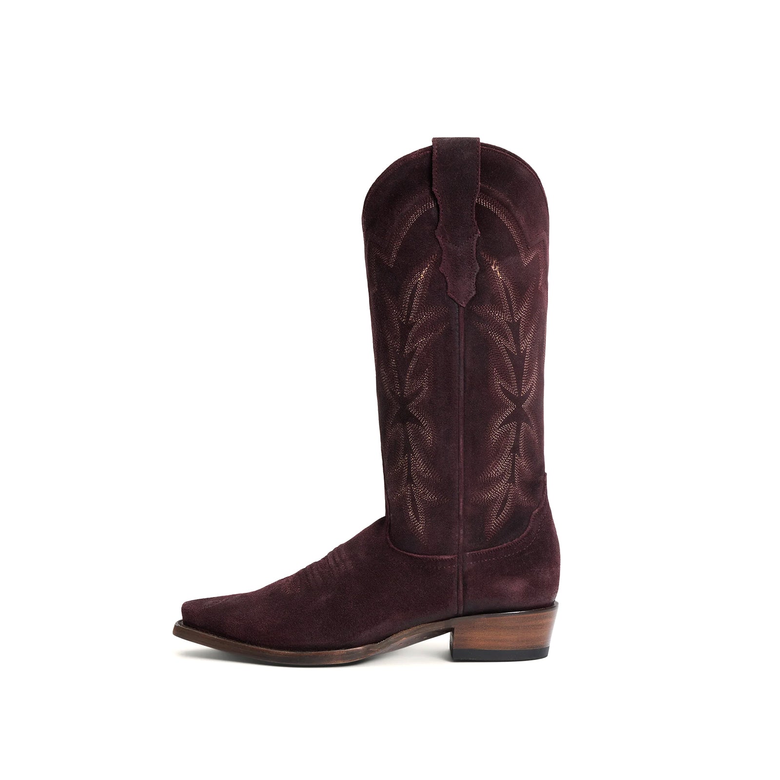 Wine Red Faux Suede Snip-Toe Embroidery Mid Calf Cowgirl Boots.