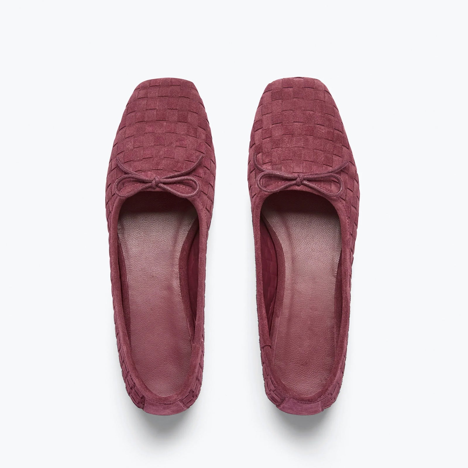 Wine Red Woven Faux Suede Square-Toe Front Bow Ballet Flats.